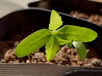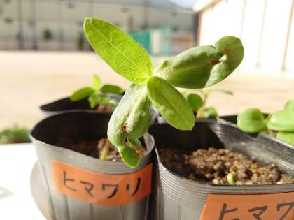 ヒマワリ、ホウセンカ、マリーゴールドが、またすこし大きくなりましたよ。