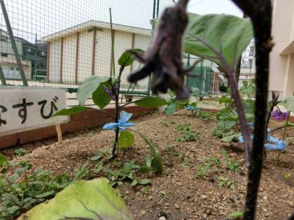 2年生の 学しゅうえん で 見つけた「ナスの花」。きょうは、その花が しゃしんの ように、しおれて いました。さあ、これから どうなるのでしょう?「あさがお」を そだてた ときは、みができて くろい たね が できましたね。「ナス」のせいちょう も おなじかな?