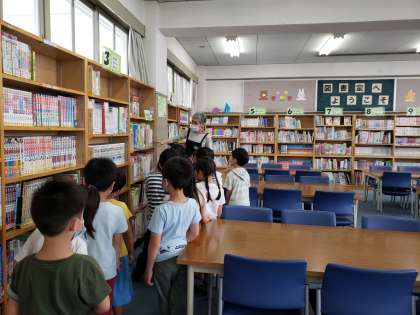 >今日は、1年生に、図書室の使い方や本の貸し借りの仕方、図書室をぐるりとまわり、どんな本があるか教えて頂きました。