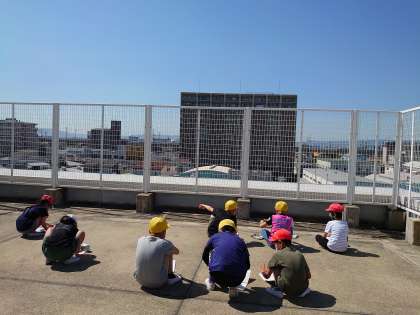 社会科の学習で、学校の屋上から田川のまちを見ました。