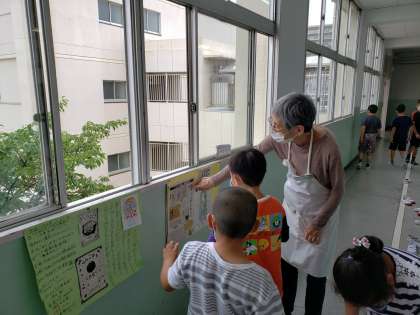 図書の時間に、面白いなが〜い絵本をみたり、昼休みは図書室や図書室前廊下の掲示物をみて過ごしたり、充実しています。