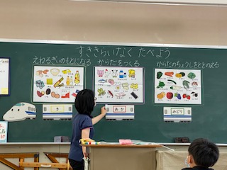 1年生に、食生活に興味・関心をもち将来にわたって健康に過ごすため、基礎となる3色食品群を知ってもらい、好ききらいなく食べることの大切さを伝えたい!と栄養教諭の先生が「すききらいなくたべよう」の授業をしてくださいました。授業後、子どもたちからは「すききらいをなくすことをがんばろうとおもいました」「これからもすききらいしません」などの感想が出てきました。