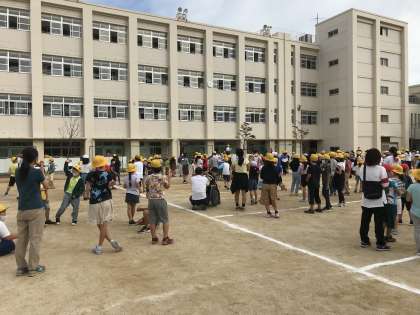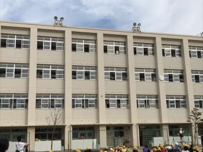 文字当てクイズをしました。校舎から集会委員会が文字を見せて、その文字をつなくゲームです。どのまどから、文字が出てくるのか、校舎全体をみわたしていたので、ほとんどのたて割り班が、正解することができました。