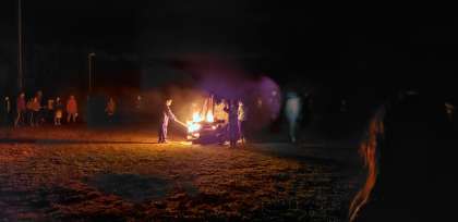 火の神から火の子へ火が授けられ、キャンプファイヤーが始まりました。歌を歌ったり、ダンスを踊ったり、猛獣狩りゲームをしたりして楽しみました。