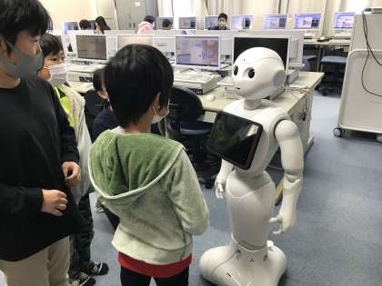 11月30日から、べっパー君を使っての、プログラミング学習が始まりました。1回目はおしゃべりや動作のプログラムを組みました。2日目は、タッチセンサーにも取り組みました。3日目は、ペッパー君が言葉を聞き取り、それに答えるブログラムを作成しました。