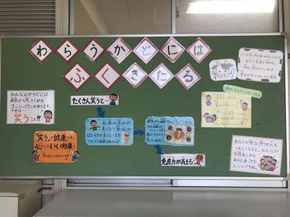 今月の保健室の掲示は、わらうかどにはふくきたるです。新型コロナウイルス感染症対策で、検温、うがい手洗い、消毒、三密をさけるなど、毎日注意を払って生活しています。それとともに、わらう効果について、考えてもらいたいと掲示しました。私たちの体の中には、病気から守ってくれるパワーがあり、それを引き出す一つが、笑うことです。笑うとこんなよいことがあると、掲示していますので、ぜひ参考にしてください。