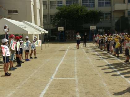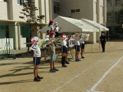 今年の運動会のスローガンである『力を合わせて一致団結‼思い出に残る運動会‼」を児童会運営委員の児童が、プラカードを掲げ紹介しました😲