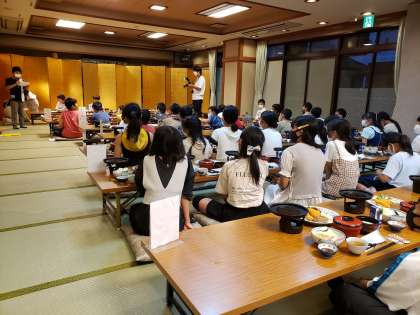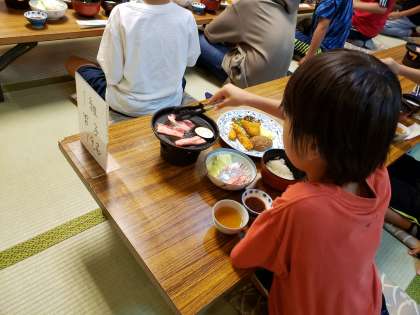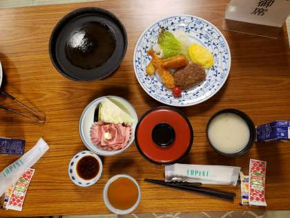 宿に着き、部屋で少し休憩をしてから夕食を食べました。自分でお肉や野菜を焼いて、おいしくいただきました。