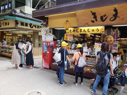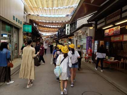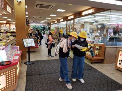 商店街へおみやげを買いに行きました。おみやげをあげたい人の顔を思い浮かべながら、一生懸命悩んでいました。自分へのおみやげを買っている人もいて、とても楽しそうです。