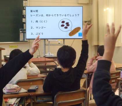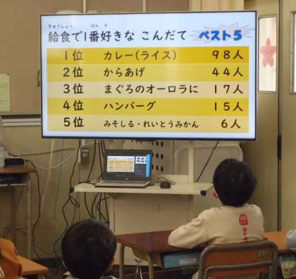 今日の集会では、給食委員会によるビデオ発表をしました。内容は、給食の歴史、調理員さんの紹介、田川小学校でおこなった給食アンケートの結果やクイズです。各学級で視聴している子どもたちは、興味をしめし、クイズを楽しんでいました。