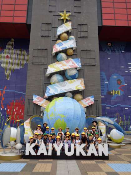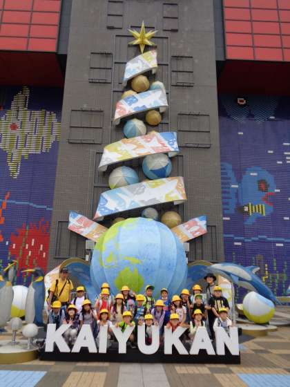 海の見える広場で弁当タイムの後は、海遊館前で記念撮影。