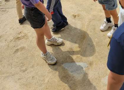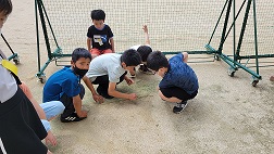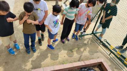 今理科で「地面を流れる水のゆくえ」の学習をしています.今日は雨が降った後の地面の様子を観察しに行きました。地面の様子を見てみると排水口に向かって水の流れた跡を発見!。何か所も実際に水の流れた後の様子を観察し、高いところから低いところに向かって水が流れるのことを学ぶことができました。