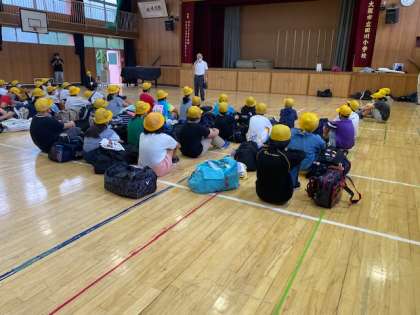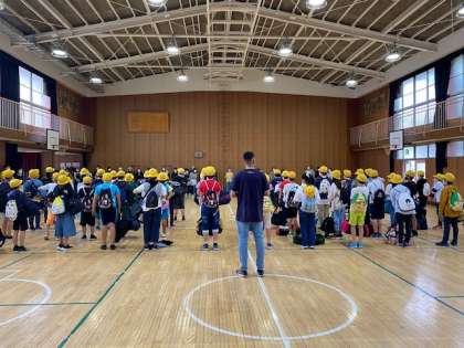 朝方に雨が降っていたため、出発式は構堂で行いました。