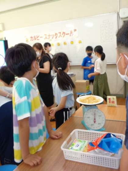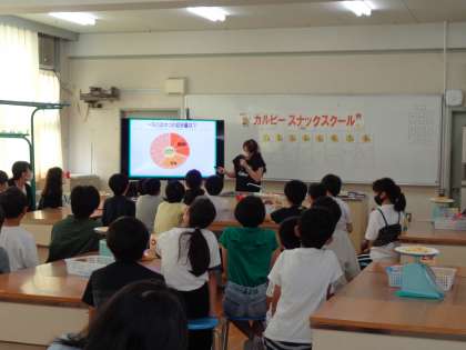 5年生が、(株)カルビーからゲストティーチャーを招き、おやつについての出前授業を受けました。楽しく有意義な学習です。