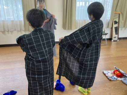 今日は、田川地域の方々が、希望の高学年児童を対象に、浴衣の着付を教えてくださいます。