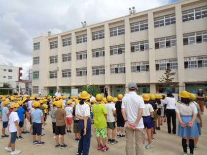 グランドに全学年の児童が集合し、校長先生からのお話や休み中の生活についての諸注意がありました。最後に校歌を黙唱しました。