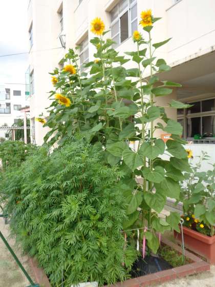 本日、1学期の終業式を迎えました。学習園のヒマワリも咲き出しています。中には、3m超のヒマワリもあります。
