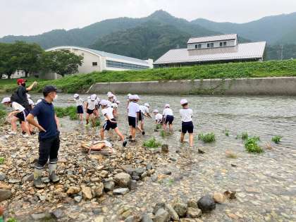宿舎の近くを流れる杉原川で、クラスに分かれて川遊びとあまごつかみ体験をしています。