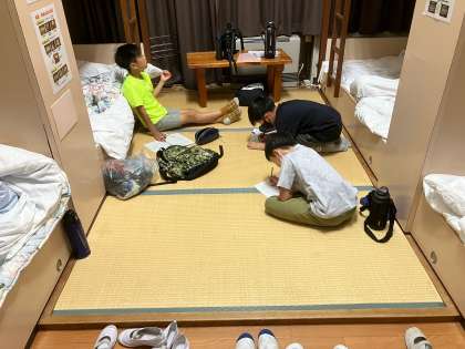 班長会議に出席しない子どもたちは、部屋で一日の振り返りを話し合ったり、しおりに書いたりしています。