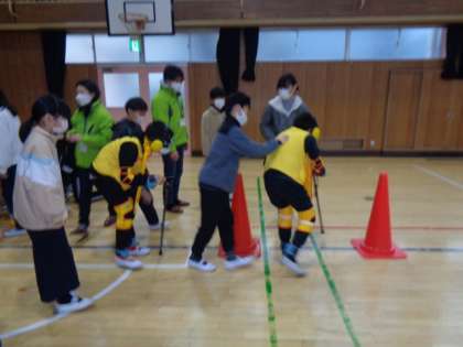 年を取ることによる体の変化を体験するというものです。様々な装具や器具を付けて貴重な体験をしました。