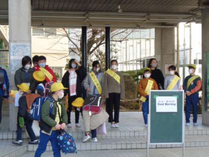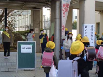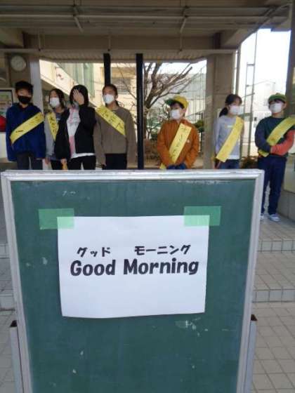 そして、世界の様々な言葉の挨拶も知ろうということで、今日は、英語の「グッドモーニング」で挨拶しました。委員の児童がタスキを付け、正門で声がけです。
