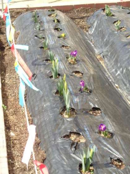中:1年生の学習園では「クロッカス」が黄色や紫色の花が咲きだしました。