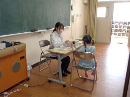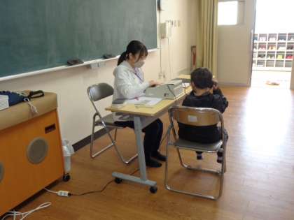 先週、始業式を迎え新学期が始まりました。と同時に、発育測定や聴力検査などの各種の保健・健康の取り組みが始まっています。画像は1年生の聴力検査の様子です。