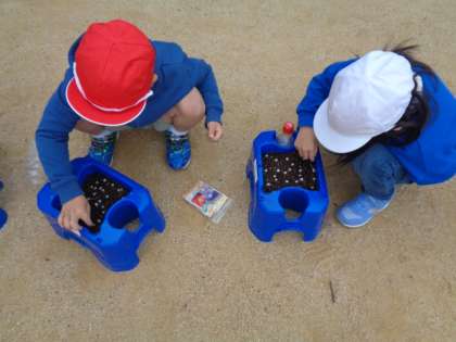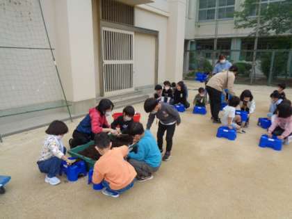 1年生が「アサガオ」と「ヒマワリ」の植え付けを行いました。「アサガオ」は、個々のプランターに植え付けます。