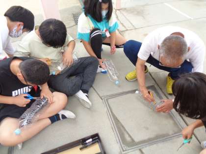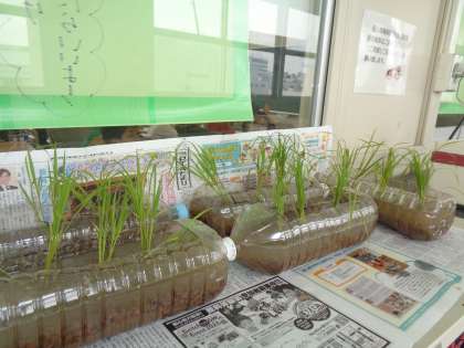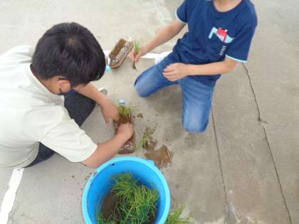 5月30日、5年生は、昨日の田植え体験に続き、残った苗で、「ペットボトル田んぼ」に挑戦です。