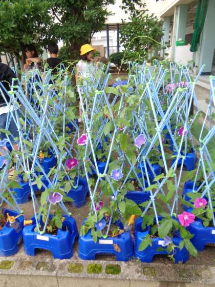 上、中:1年生の「アサガオ」の花が咲きだしました。また「ヒマワリ」も2m超えの成長です。あと少しで、黄色の花が咲きそうです。