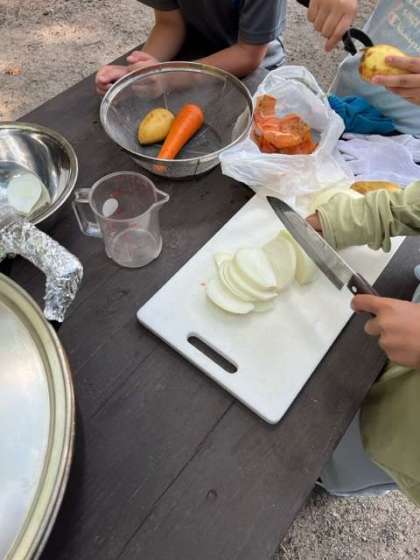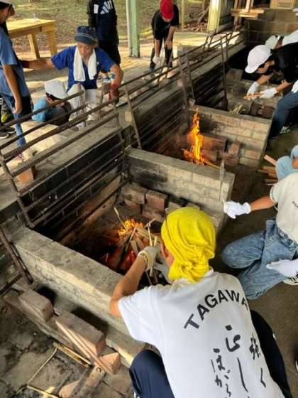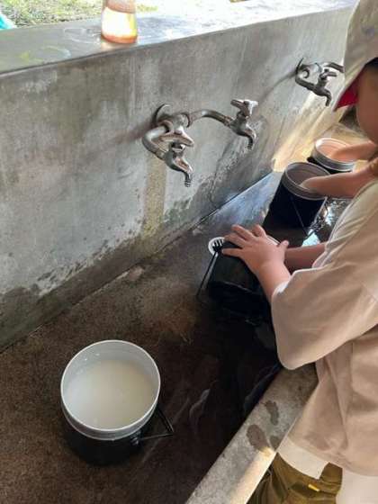 写真 下:米をといでいます!宿舎の方が、美味しいごはんが大事とおっしゃっていました!