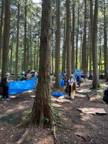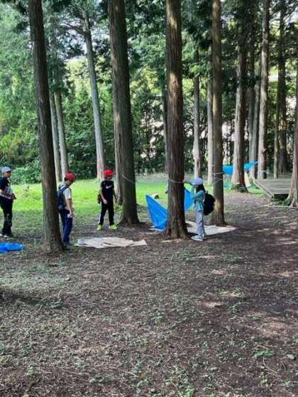 その中の一つに昨日みんなで作った秘密基地の解体があります。班で協力しながら元の林に戻します。