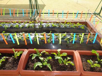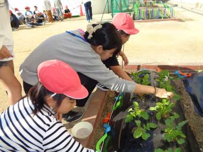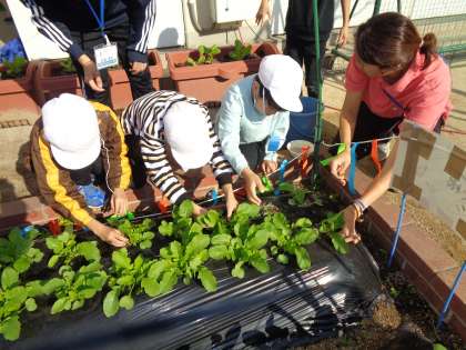 10月26日、種まきから16日目です。3年生が植え付けを行ったダイコンの間引き、追肥、土寄せの体験を行いました。