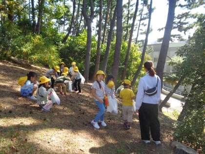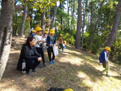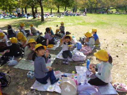 ドングリや松ぼっくり拾いの後は、お楽しみの弁当タイムです。秋晴れの中でのランチは最高でした。