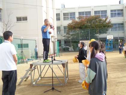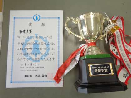 3連休明けの学校です。今日の全校朝会で、田川子ども会ダンス部が最優秀賞となり、表彰状と記念のカップの伝達を行いました。