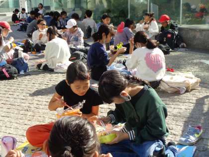 弁当は、ビルの広場で「いただきます!」です。