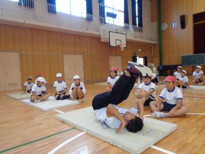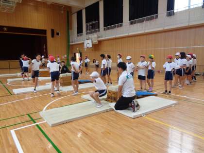 5年生も、とび箱を教えていただきました。最後は、台上前転に挑戦しましたよ!