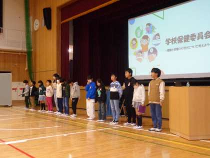 保健と健康をテーマに、児童会保健委員会や給食委員会の児童が、発表を行い、参加者全員で考えを深めました。