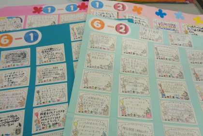 児童朝会で校長先生から給食週間についての話を聞いたり、給食調理員さんに各学級からの寄せ書きを渡したりしました。