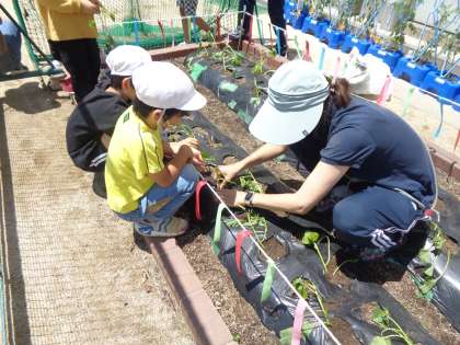 今日は、2年生が、生活科「ぐんぐんそだてわたしの野菜」の学習で、サツマイモの苗を植えました。