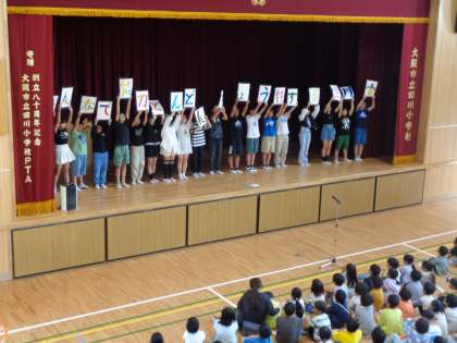本日の児童朝会にて、運営委員の子どもたちが考えた学校目標が発表されました。