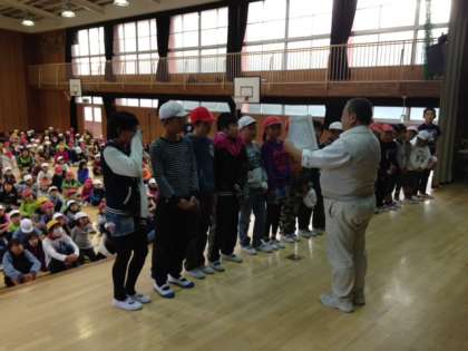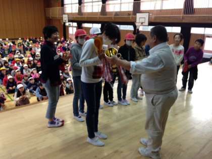 今回の児童集会は、好きな食べ物や特技から、どの先生かを当てる先生当てクイズをしました。また、第2回中津杯で準優勝したソフトボールチームと、大阪市小学生バレーボール冬季大会で優勝したバレーボールチームの表彰がおこなわれました。