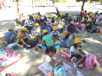 1・2年遠足で服部緑地公園に行きました。公園では、最初にどんぐり拾いと落ち葉拾いをしました。いっぱい拾ったどんぐりと落ち葉は、学校で作品作りに使います。昼食後遊具で遊んで帰ってきました。