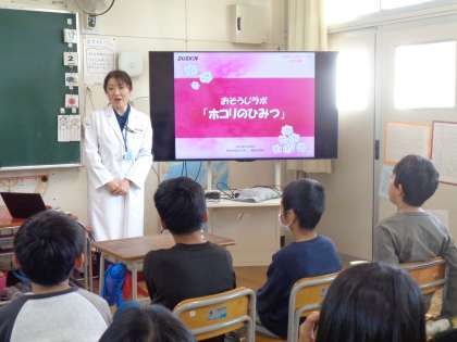 授業では、まずはじめに「ホコリのひみつ」について教えてもらいました。ホコリってどんなものかな?どんなところにたまりやすいかな?など、たくさんのことを教えてもらいました。その後は、ホコリをしっかりとるための雑巾やほうき、掃除機などの上手な使い方を、実践を交えて教えてもらいました。