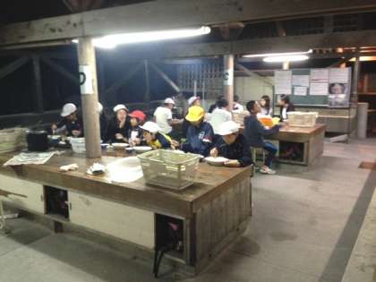 午後白坂コースへのハイキングに行き、登山をしました。急な石ころだらけの道やぬかるんだ道を登ったりけっこう大変でした。夕食は、飯ごう炊飯。カレー作りをしました。