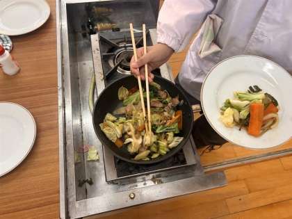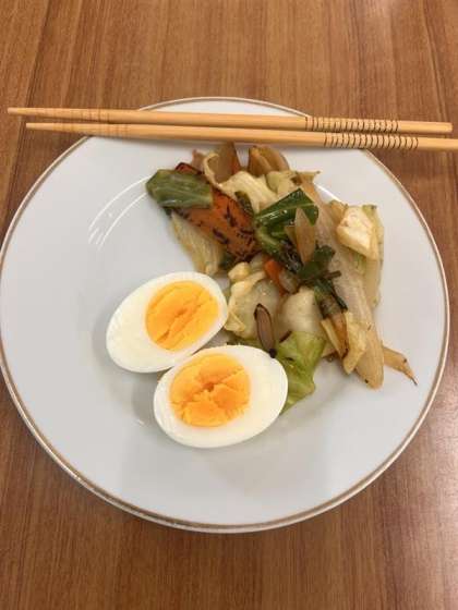 「ゆでる」と「いためる」の2つの調理をし、ゆで卵と野菜炒めが完成しました。