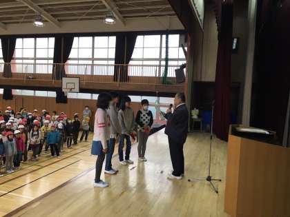 今回の朝会では、夏休みに書いた世界平和に関するポスターの表彰が行われました。また、音楽名人の発表も行われました。みんなとてもがんばりました。