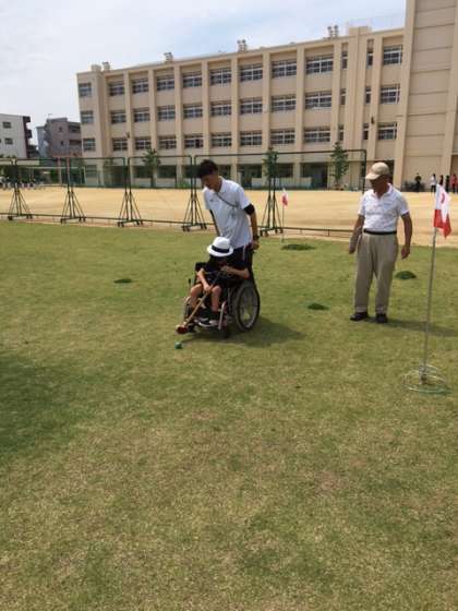 5年生の人は、はじめてのグランドゴルフにとまどいながらも、楽しんでいました。中には、ホールインワン?!をした人もいたようです。