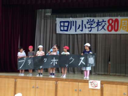 児童集会で、田川フェスティバルのお店紹介がありました。