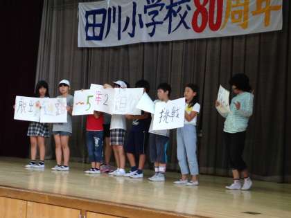 児童集会で、田川フェスティバルのお店紹介がありました。